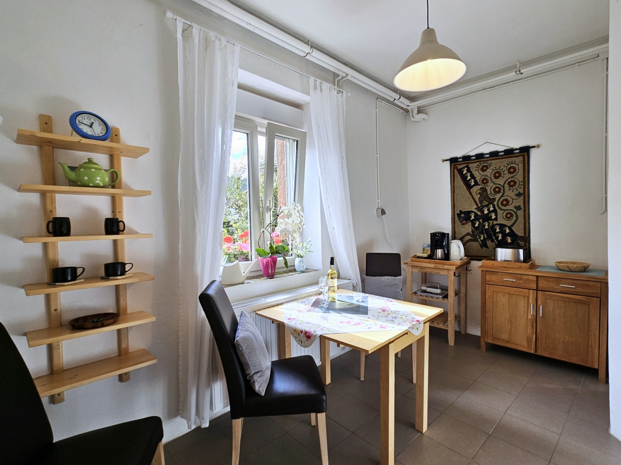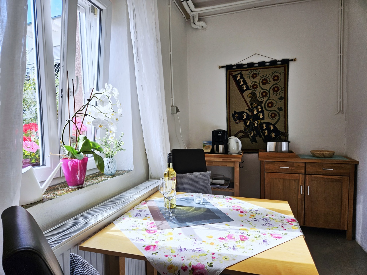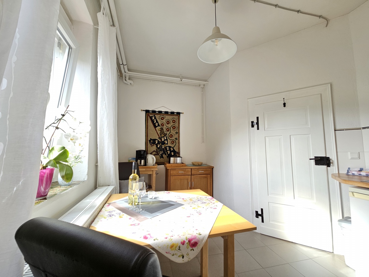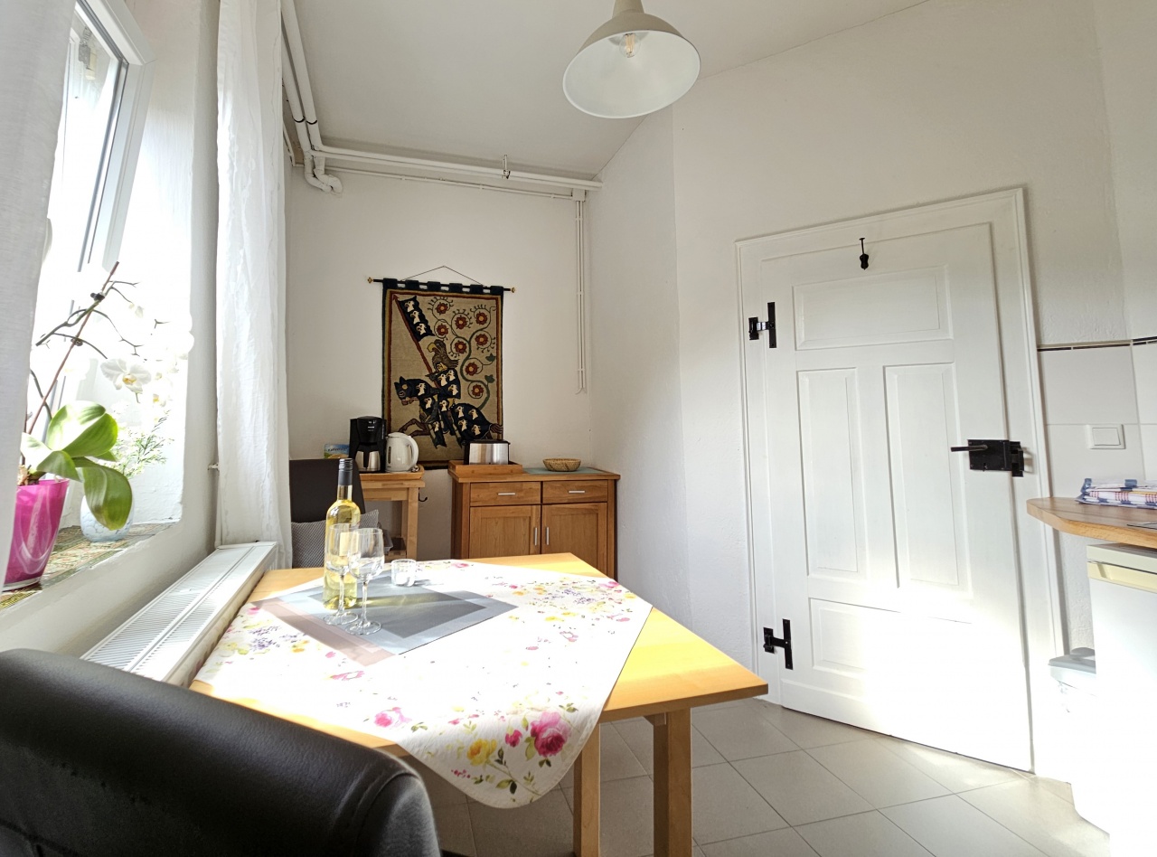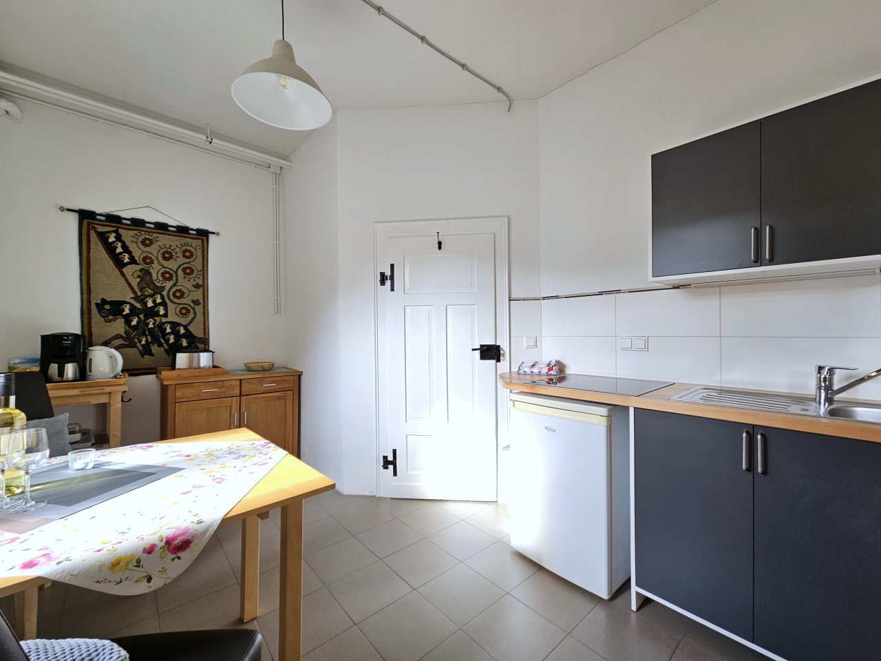 Komplett eingerichtete Küche mit Ceranfeld und Esstisch, Mikrowelle, Kühlschrank mit Gefrierfach, Kaffeemaschine, Toaster und Wasserkocher.