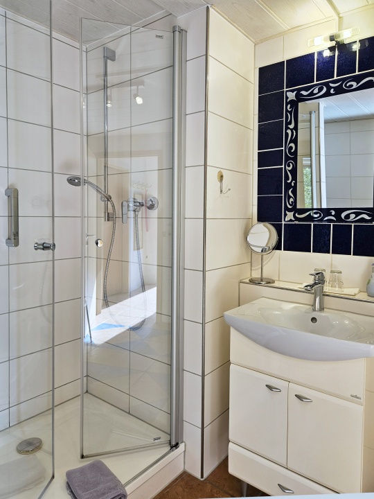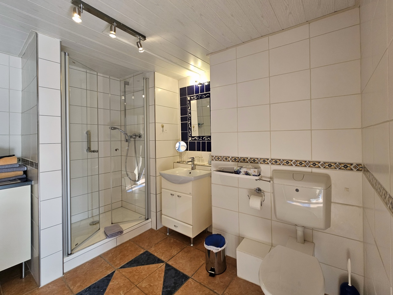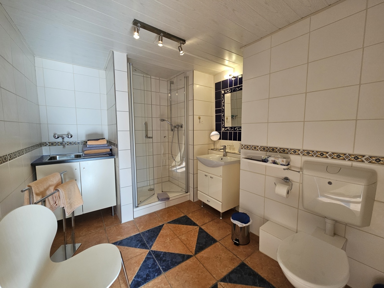 Das Bad ist mit Dusche und WC und Fön ausgestattet. Direkt am Haus steht Ihnen ein Parkplatz zur Verfügung, und Ihre Fahrräder können sicher im ebenerdigen Keller untergebracht werden.
