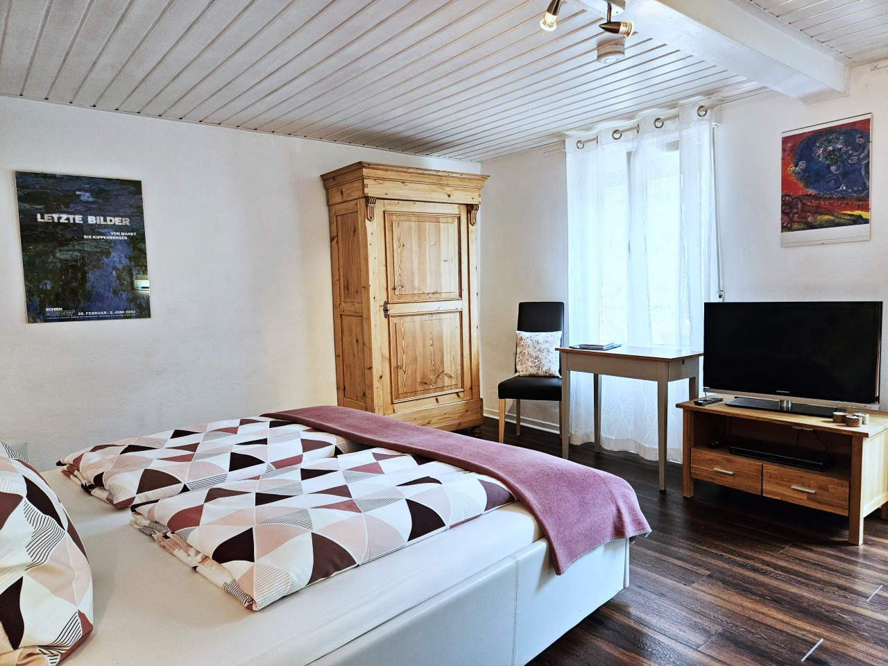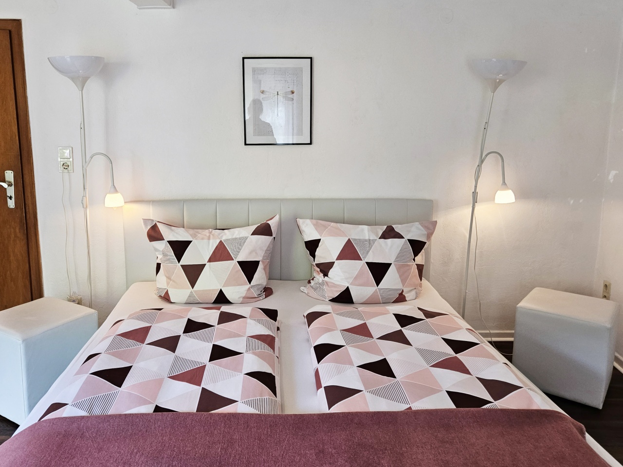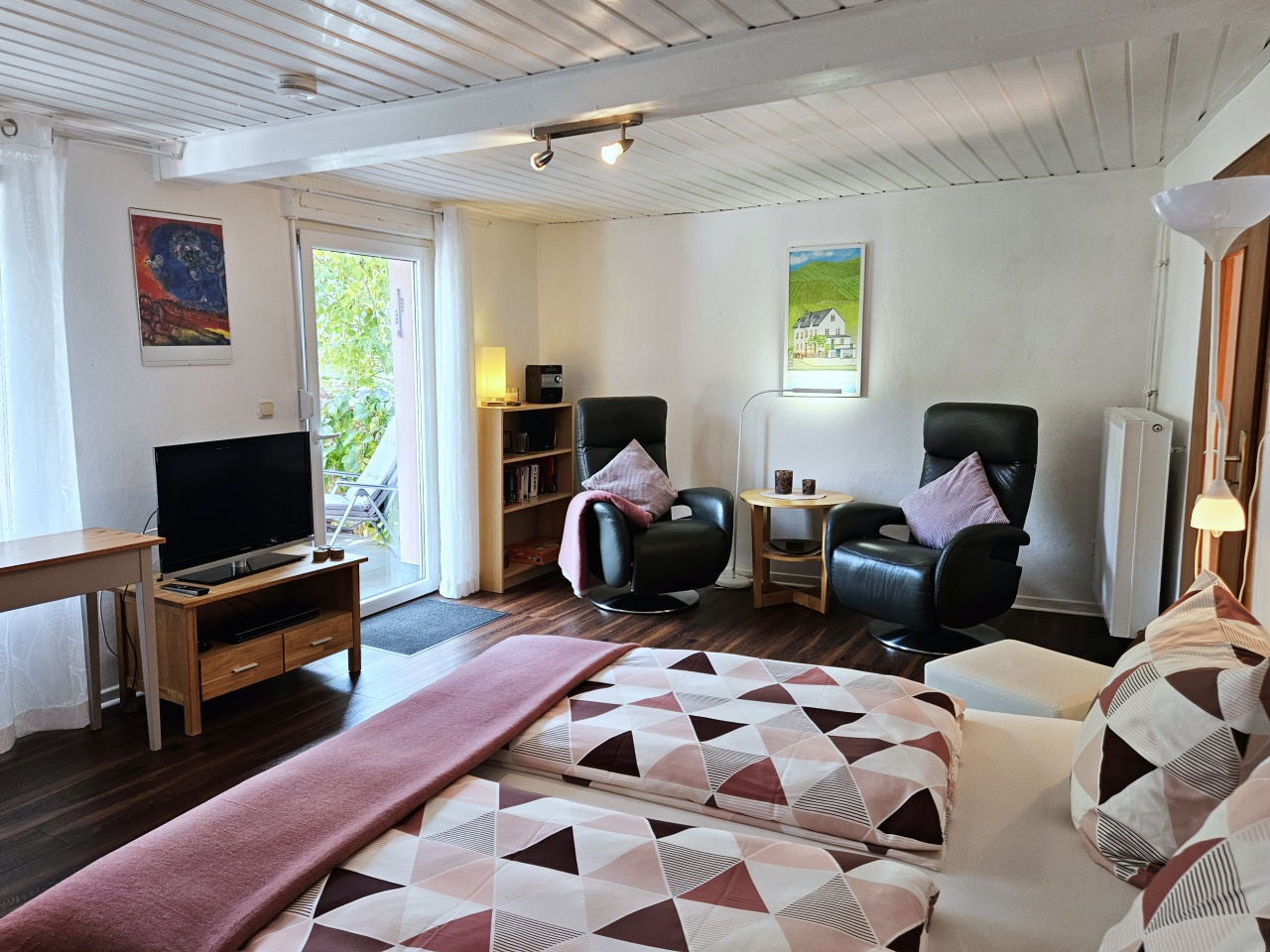 Ein schöner heller Wohn- Schlafraum liegt zur Moselseite mit modernem Doppelbett, 2 sehr bequeme Relaxsessel, Flachbild Sat-TV, Blueray DVD-Player. Von hier geht der Ausgang zum großen moselseitigen Balkon (20 qm) mit Sitzgarnitur und 2 Liegestühlen.