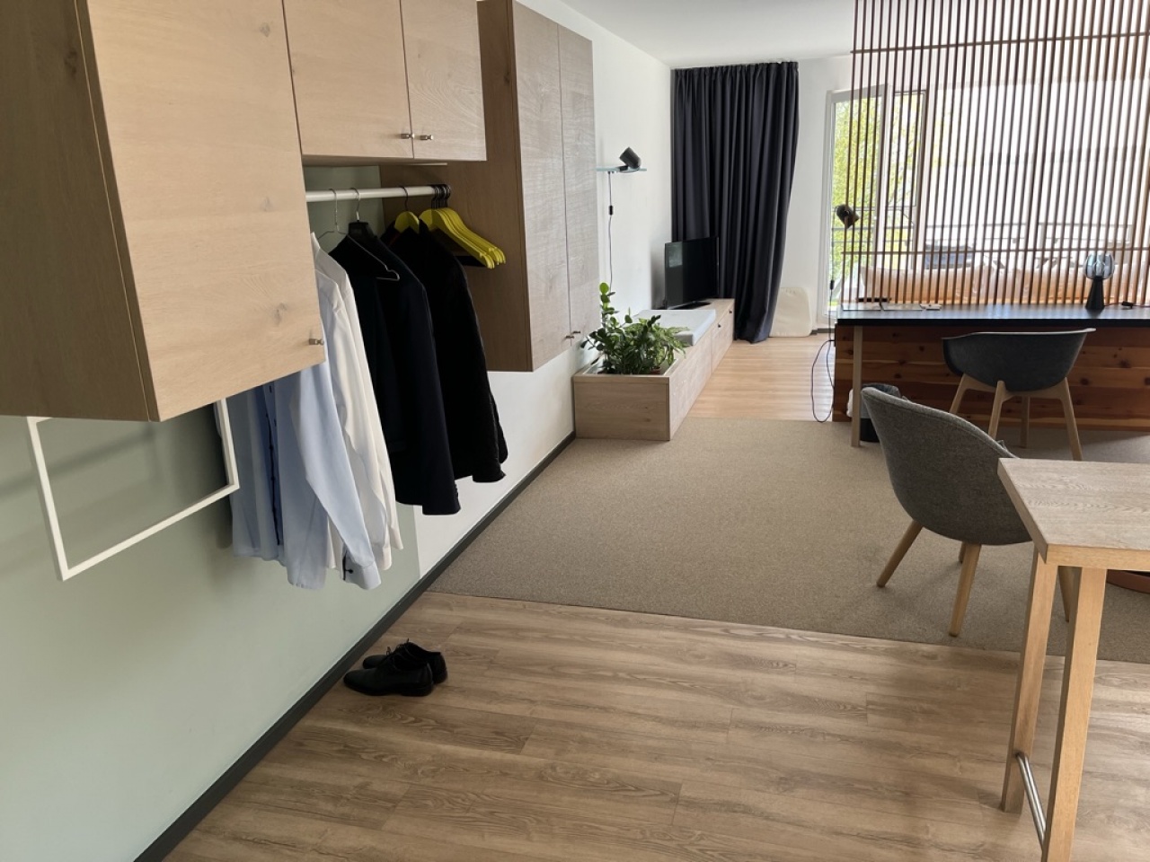 Unsere große und helle Ferienwohnung (Eckwohnung im 1. OG) verfügt über ein großes Zimmer mit einem großen Bett (1,80 x 2,00 m) aus Zirbenholz, eine Sitzecke mit einem Sofa (kann auch als Schlafplatz genutzt werden) und zwei Sesseln, ein Duschbad mit Fenster, eine voll ausgestattete Küchenzeile mit Kühlschrank, Besteck, Geschirr, Wasserkocher, Filter-Kaffeemaschine, Toaster, Mikrowelle mit Grillfunktion und Herd (inkl. Töpfe) sowie einen 43“ TV-Fernseher (Kabel TV) gehören zur Ausstattung.